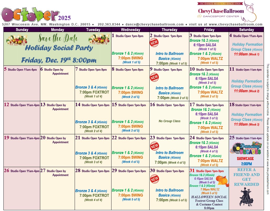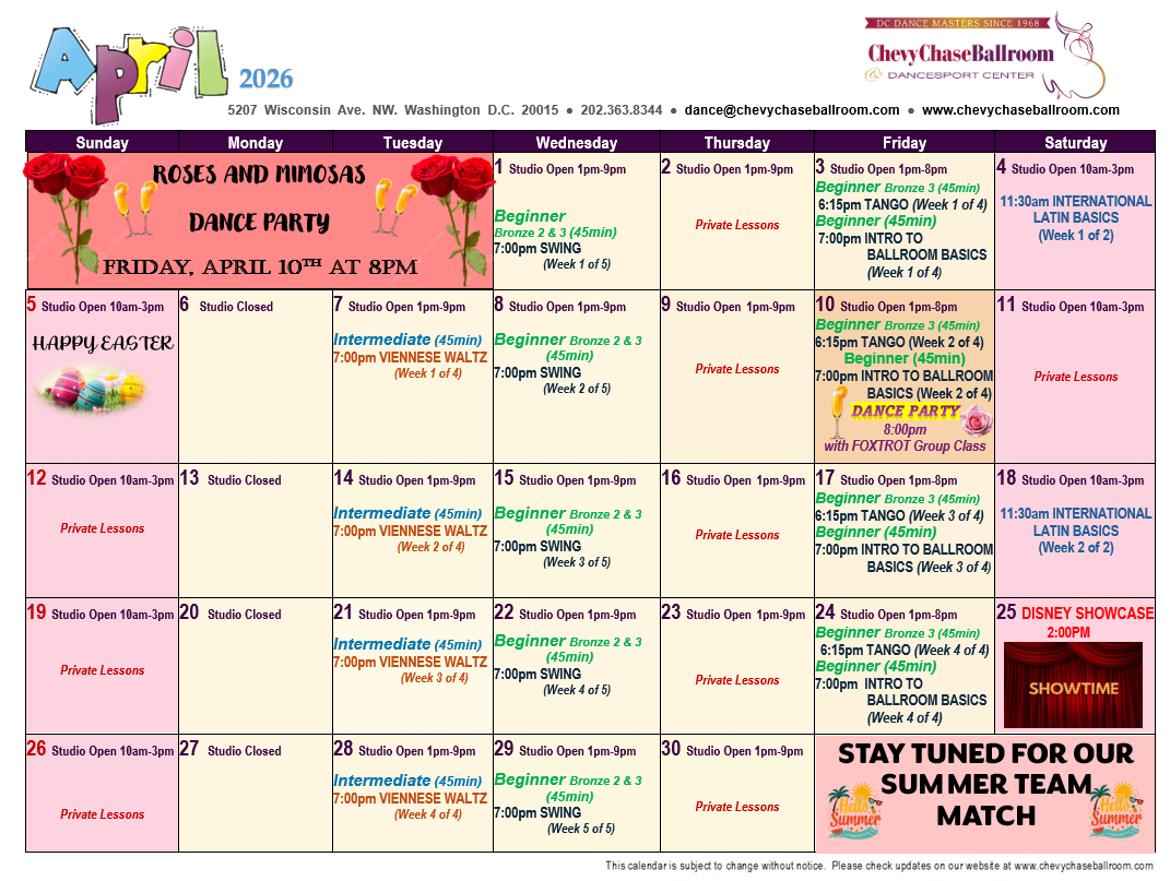 From beginner to advanced, our diverse schedule offers something for everyone. Join us for group classes, private lessons, and social dance events.